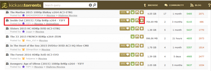 এখানে চিত্রটা লক্ষ্য করুন, বামপাশের যে লাল ঘর আছে এখানে লিখা Inside Out এটা একটা মুভির নাম, 720p ভালো কোয়ালিটির প্রিন্ট, আর YIFY হল যারা এই ফাইল/মুভি আপলোড করেছে। একটা বিষয় মনে রাখবেন YIFY 720p আর এদের বেগুনি স্টার চিহ্ন দেখলে নিশ্চিত থাকবেন যে ভালো কোয়ালিটির মুভি। এবং প্রায় সব ক্ষেত্রে এর সাইজ হবে ১ জিবি এর মধ্যে। যাই হোক ডানপার্শ্বে লাল চিহ্নের এখানে ক্লিক করলে মুভিটির টরেন্ট ফাইল ডাউনলোড হবে।