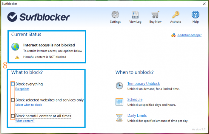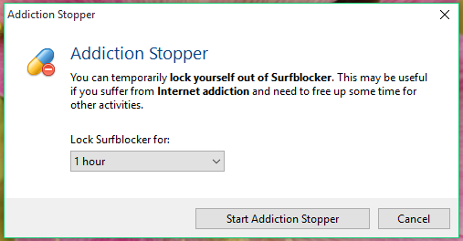 ০৮। Addiction Stopper: এই অপশনটি ব্যবহার করে কোন ঝামেলা ছাড়াই একটি নির্দিষ্ট সময়ের জন্য surfblocker বন্ধ করতে পারবেন।