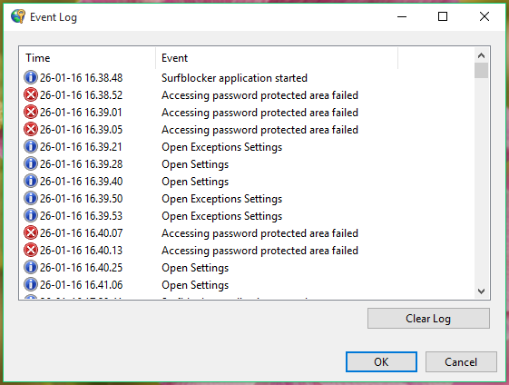 ০৯। Event Log: এই অপশনটির মাধ্যমে দেখতে পারেন surfblocker এ কী কী পরিবর্তন হয়েছে।