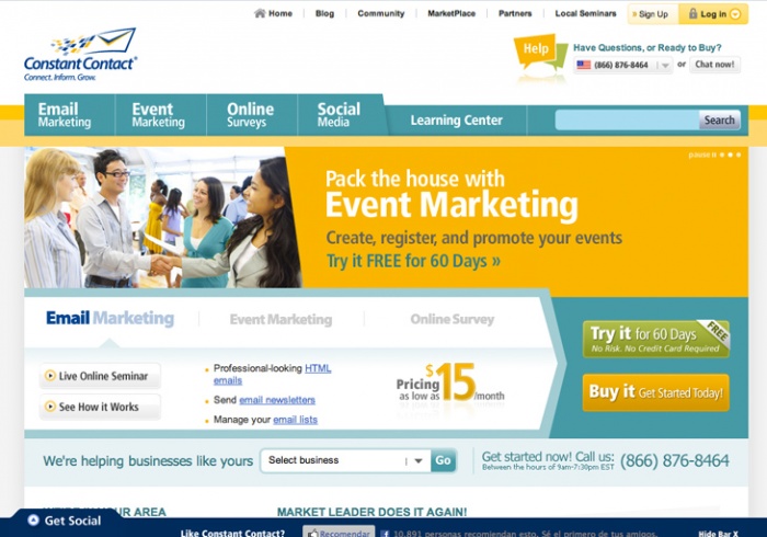 9. ConstantContact : ইমেল মার্কেটিং সার্ভিসের দিক থেকে এই প্লাটফরমের কথা প্রায়ই শুনা যায়। ৬০ দিনের জন্য এরা ফ্রি ট্রায়াল করার সুযোগ দিয়ে থাকে। সার্ভিসের মান দিন দিন এরা যেভাবে বাড়াচ্ছে তাতে খুব শিঘ্রই এরা আরো প্রথমদিকে চলে আসার সম্ভবনা থাকছে। ইমেল মার্কেটিং এর পাশাপাশি ইভেন্ট মার্কেটিং, অনলাইন সারভে, সোসিয়াল মার্কেটিং সার্ভিস দিচ্ছে।