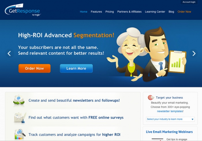 8. GetResponse : জনপ্রিয়তা ও সার্ভিসের দিক থেকে ইমেল মার্কেটিং প্লাটফরম হিসেবে এদের অবস্থান দ্বিতীয় সর্বোচ্ছ। প্রফেশনাল ইমেল মার্কেটাররা মেইলছিম্প এর পরেই এই মার্কেটপ্লেসকে তাদের ইমেল মার্কেটিং কাজের জন্য প্রছন্দের ক্ষেত্র মনে করেন।