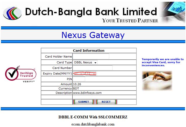 ৪. সবকিছু ঠিক থাকলে “Submit or Next” দিয়ে চলে যান DBBL এর সাইটে । দেখুন নিচের ছবির মত খালি ফর্ম চলে এসেছে । এখানে আপনার কার্ড-এ দেওয়া নাম, কার্ড টাইপ, কার্ড নাম্বার এবং পিন কোড দিয়ে "subnit" বাটনে ক্লিক করুন ।
