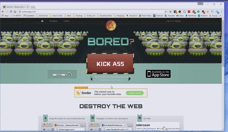 kickassapp.com: জাভা ভিক্তিক ওয়েবসাইট গেম এটি! অফিসে কাজ করতে করতে বোর হয়ে গেছেন তাহলে এখনি এই সাইটে চলে যান এবং লাল বক্সটি ড্রাগ করে আপনার বুকমার্ক টুলবারে রেখে দিন। এবার যেকোনো ওয়েবসাইট চালূ করুন এবং ওই বুকমার্কে ক্লিক করুন! দেখবেন একটি স্পেসশিপ চলে এসেছে এবং কীবোর্ডের অ্যারো কী এবং স্পেসবারের সাহায্যে ওপেনকৃত সাইটের সাথে ধ্বংসাত্বকমূলক গেম খেলায় মেতে উঠতে পারবেন! বেশ মজার একটি জিনিস!
