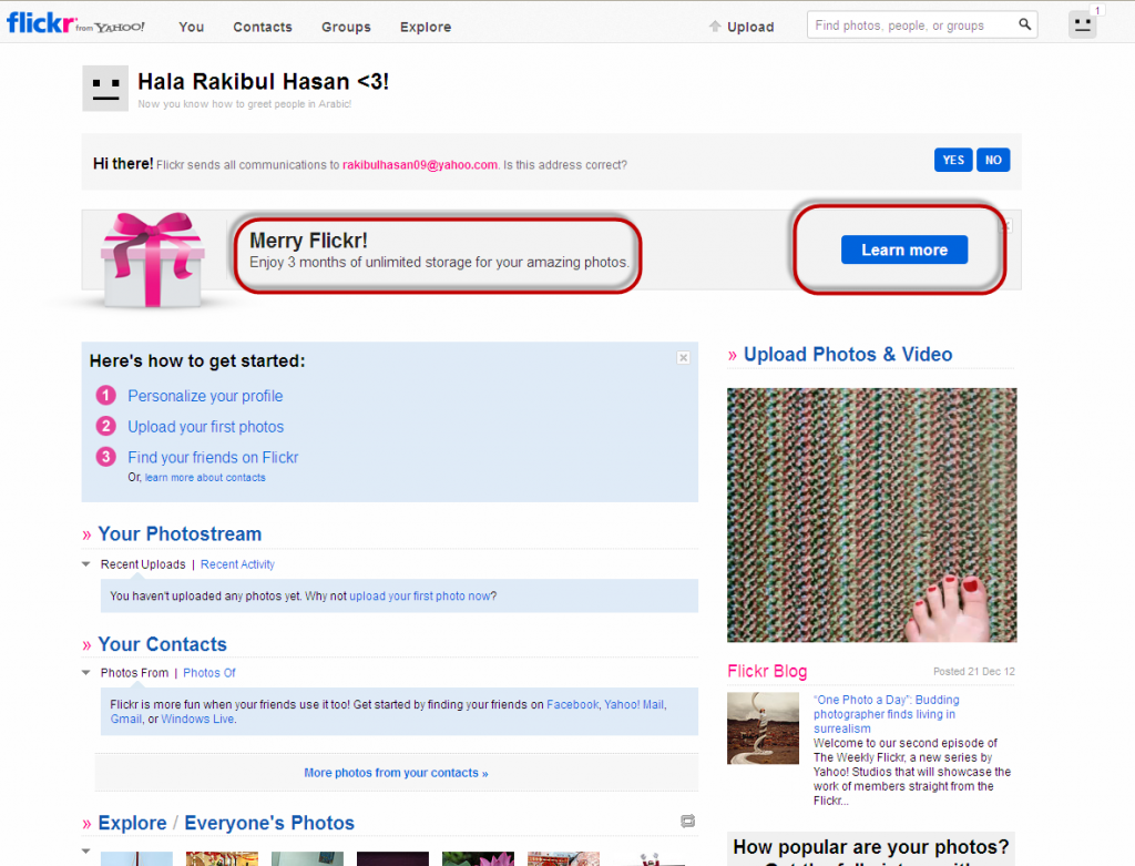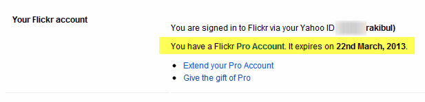 প্রথমে এখানে ক্লিক করে ইয়াহু একাউন্ট দিয়ে একটি flickr একাউন্ট খুলে নিন । একাউন্ট খোলা হলে নিচের মত একটি পেজ আসবে । এবার ছবির মত একটি একটি ক্লিক করে জান । এবং নিয়ে নিন প্রো একাউন্ট ৩ মাসের জন্য!