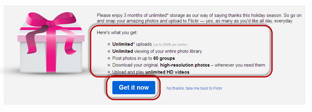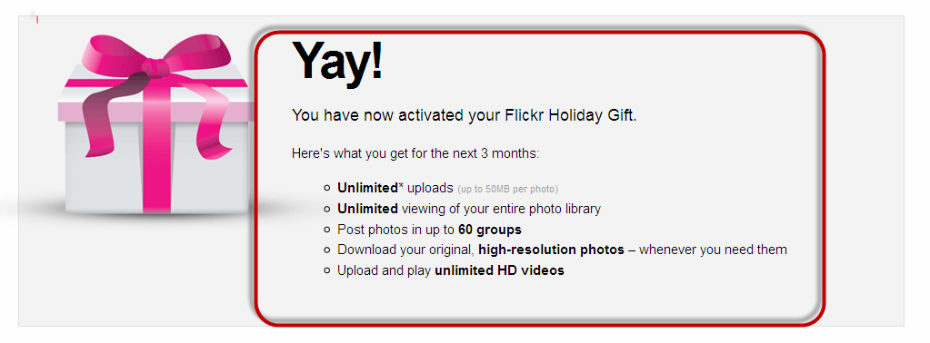 হ্যাঁ! নতুন বছর এবং ক্রিসমাস উপলক্ষে flickr.com দিচ্ছে ফ্রী প্রো একাউন্ট । তেদের একটি ৩ মাসের প্রো একাউন্ট এর মুল্য ৬.৯৫ বা প্রায় ৭ ডলার । তারা এই একাউন্ট দিচ্ছে সম্পূর্ণ ফ্রী তে ।