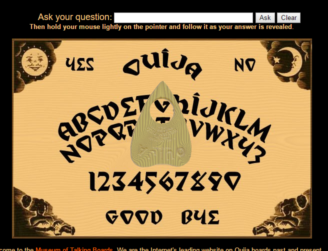 হেই বন্ধুরা, আপনি কি ওয়াইজা বোর্ড সম্পর্কে জানেন? আমি মনে করি আপনি জানেন না! মূলত, এই ওয়েবসাইটটি ঘোস্টদের সঙ্গে কথা বলতে ব্যবহৃত হয়? এটা সত্যিই ভয়ঙ্কর এবং খুব ভয়ঙ্কর! কিন্তু আমি এটি বিশ্বাস করি না! শুধু উপরের বাক্সে কোনও প্রশ্ন লিখুন এবং তারা আপনার উত্তর প্রদান করবে কার্সর সরানোর মাধ্যমে। আমি এটি বাস্তব মনে করি না। আমি এই ওয়েবসাইট দেখার জন্য আপনাকে সুপারিশ করছি না। দুর্বল হৃদিয়ের মানুষ এই সাইট দেখার চেষ্টা করবেন না।