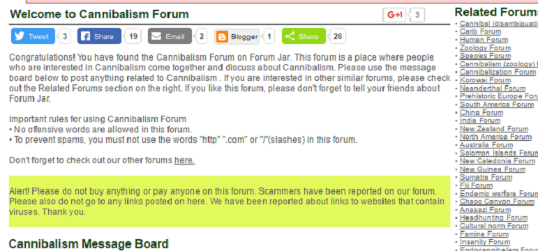 হেই বন্ধুরা, আপনি কি জানেন! ক্যানিবালিজম কি? আমি নিশ্চিত যে আপনি সে সম্পর্কে জানেন না! এর মানে যারা মানব দেহ ইত্যাদি খায়! মূলত এটি ক্যানিবালিজম সম্প্রদায়ের একটি ফোরাম, যেখানে ক্যানিবালিজম সম্প্রদায় একে অপরের সাথে কথা বলে। আমি এই ওয়েবসাইট দেখার জন্য প্রস্তাব করছি না। দুর্বল হৃদিয়ের মানুষ এই ওয়েবসাইট থেকে দূরে থাকুন। আপনি নীচের লিঙ্কে এই সাইটটি পরিদর্শন করতে পারেন।