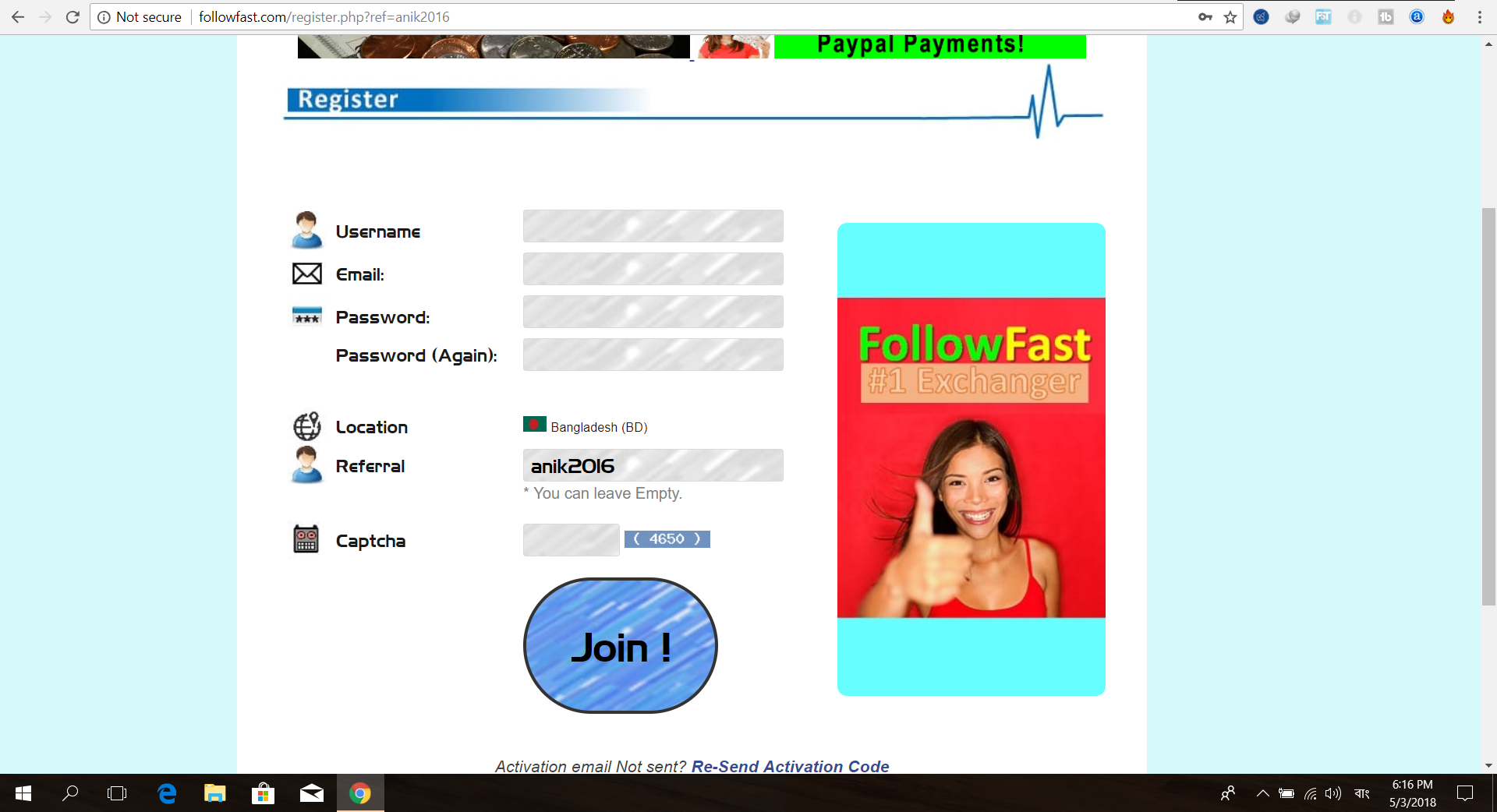 একাউন্ট খোলার জন্য ক্লিক করুন ফলোফাস্ট। তারপর নিচের মত একটি ফরম আসবে অই খানে আপনার নাম, ইমেল, পাসওয়ার্ড, ক্যাপচা সঠিক ভাবে পুরন করে জয়েন বাটনে ক্লিক করুন। দেখুন আপনার ইমেল এ একটি কনফার্ম মেইল গেছে। অই খানে থেকে কনফার্ম করে লগ ইন করুন।