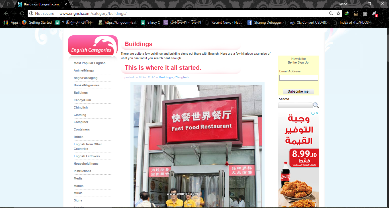 ইংরেজি বানানের ভূলগুলো দেখতে আপনি পছন্দ করেন? তাহলে এই সাইটটি আপনারই জন্য। এই সাইটে গেলে আপনি বিভিন্ন ধরনের হাস্যকর বানানের ভূলগুলো এবং হাস্যকর ইংরেজি উচ্চারণগুলো দেখতে পারবেন। এই সাইটকে বিভিন্ন ক্যাটাগরিতে ভাগ করা রয়েছে, সেগুলো আপনি নিজে নিজে ঘেঁটে ঘেঁটে দেখতে পারেন এবং নির্মল “বিনোদন” লুটে নিতে পারেন! সাইটটির লিংক: http://www.engrish.com/