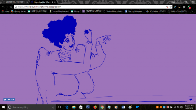মোটা মহিলা অ্যাপল ভালোবাসে! ওয়েবসাইটের নামটাই কেমন জানি অদ্ভুত! এর কাজও সেরকমই অদ্ভুত! এই “মানসিক ভারসাম্যহীন” ওয়েবসাইটের কনসেপ্ট হচ্ছে একটি মোটা মহিলাকে মাউসের সাহায্যে অ্যাপল খাওয়ানো। মাউসের সাহায্যে মহিলাটি হাতকে নিয়ন্ত্রিত করে লেফট ক্লিকের মাধ্যমে অ্যাপলকে ধরুন, তারপর তার মুখে কাছে মাউস ড্রাগ করে এনে ছেড়ে দিন, মহিলাটি অ্যাপলকে খেয়ে ফেলবে, তারপর আবার নতুন আরেকটি অ্যাপল আসবে। সাইটটি ক্রিয়েটিভ হলেও একটু অন্যরকম। সাইটের লিংক: https://www.iloveyoulikeafatladylovesapples.com/