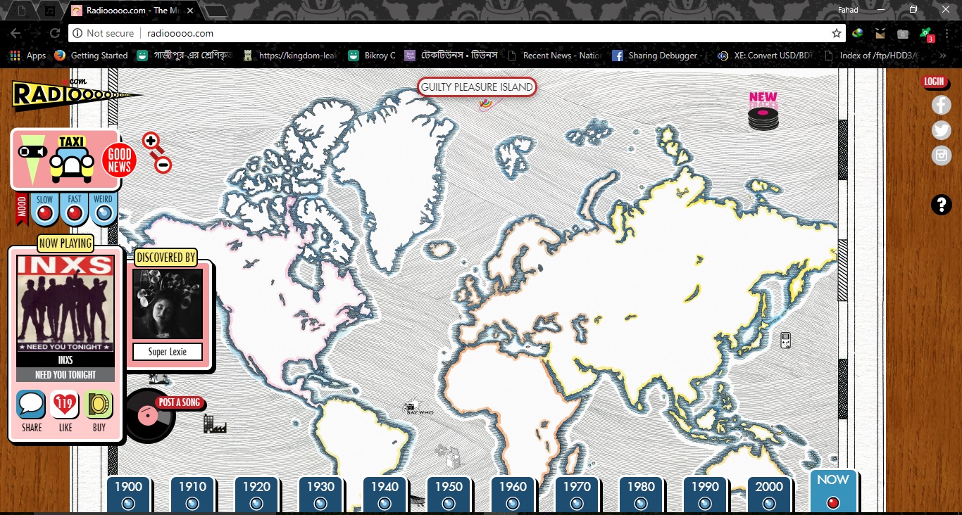 ইতিহাসের প্রায় ১০০ বছরের মিউজিকগুলোকে নিয়ে একটি ইউনিক সাইট হচ্ছে এই Radiooooo। সাইটকে গেলে আপনি একটি কাটুর্নের মতো বিশ্বের ম্যাপ পাবেন। এবার আপনার কাজ হলো মাউসের সাহায্যে ম্যাপে যেকোনো একটি দেশকে সিলেক্ট করা। তারপর নিচের টাইমলাইনে পছন্দমতো যুগ নির্বাচন করুন; তাহলে দেখবেন যে ওই দেশের ওই যুগের একটি গান বাজা শুরু হয়েছে! ম্যাপে আপনি অনান্য সাধারণ ম্যাপের মতোই জুম ইন করতে পারবেন! মিউজিক নিয়ে বেশ ইউনিক একটি সাইট এটি। সাইটটির লিংক: http://radiooooo.com/