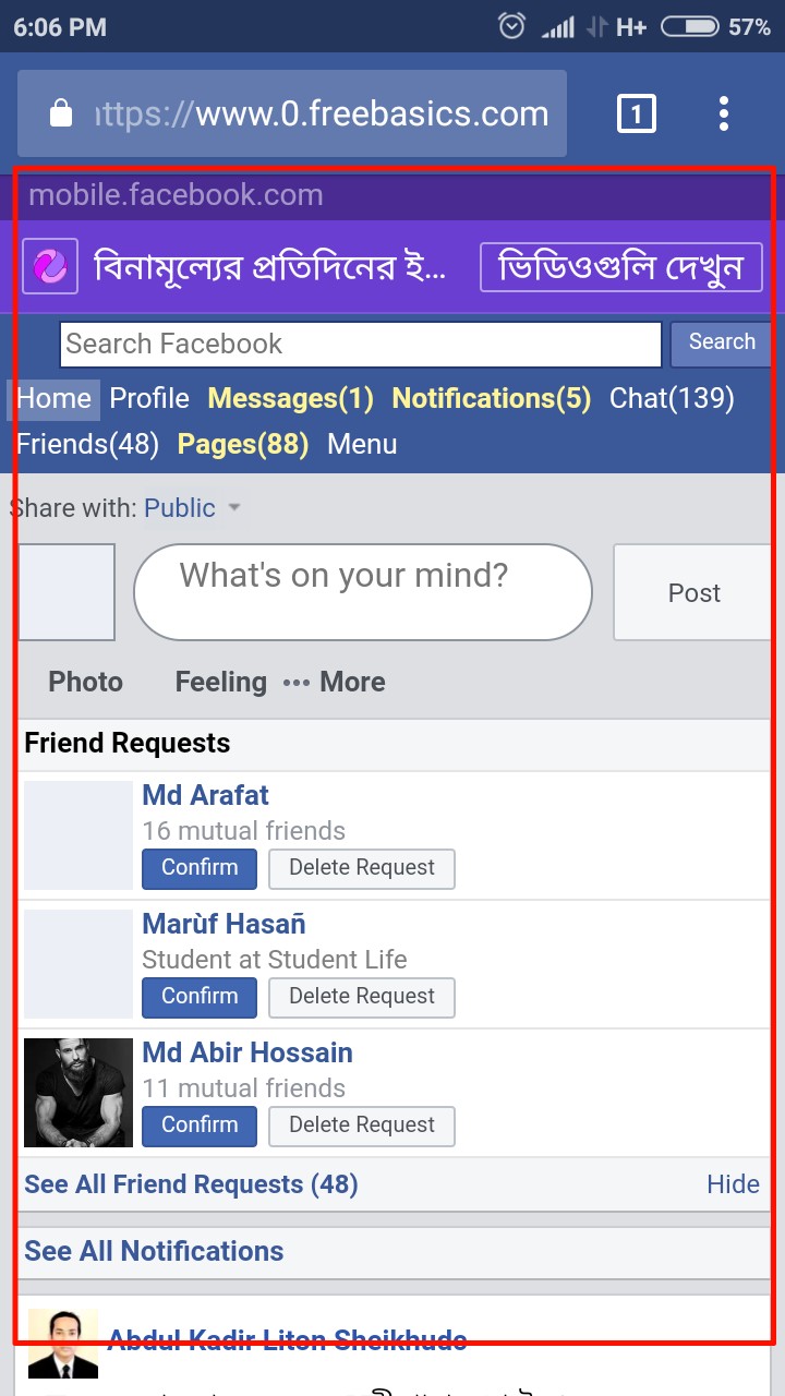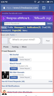 গুগল ছাড়াও এখন ফ্রিব্যাসিক্সের মাধ্যমে ছবিসহ মোবাইল ফেসবুকও একদম ফ্রিতে ইউস করতে পারবেন ঠিক উপরের স্ক্রিনশটের মত। ফ্রি ফেসবুক চালাতে ফ্রিব্যাসিক্স সাইটের হোমপেজের জনপ্রিয় লেভেলের নিচের Facebook লেখা বা আইকনটিতে ক্লিক করুন। অথবা এই https://www.0.freebasics.com/https/m.facebook.com/ লিংকে ক্লিক করুন বা কপি করে ব্রাউজারের সার্চবারে পেস্ট করে সার্চ করুন।