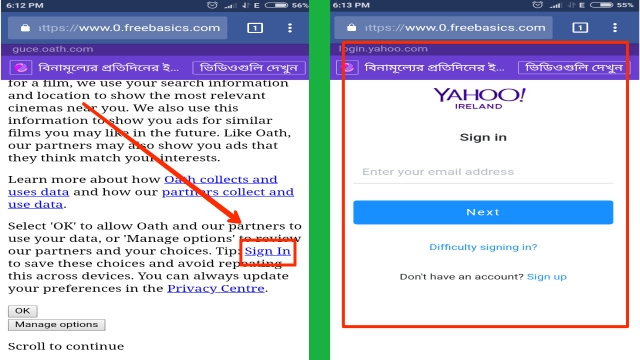 গুগল, ফেসবুক, টুইটার, ইনস্টাগ্রাম ও লিংকডইন ছাড়াও ইয়াহুও এখন ফ্রিব্যাসিক্সের মাধ্যমে ইউস করতে পারবেন। ফ্রি ইয়াহু চালাতে ফ্রিব্যাসিক্স সাইটের হোমপেজের জনপ্রিয় লেভেলের নিচের Yahoo লেখা বা আইকনটিতে ক্লিক করুন। এর জন্য আপনাকে Yahoo তে ক্লিক করার পর বামপাশের স্ক্রিনশটের মত আসলে Sign In বাটনে ক্লিক করুন। ক্লিক করলে ঠিক ডানপাশের স্ক্রিনশটের মত আসবে। ব্যাস, এখন ফ্রিতে ইয়াহুও ইউস করতে থাকুন। অথবা এই https://www.0.freebasics.com/https/en.yahoo.com/ লিংকে ক্লিক করুন বা কপি করে ব্রাউজারের সার্চবারে পেস্ট করে সার্চ করুন।
