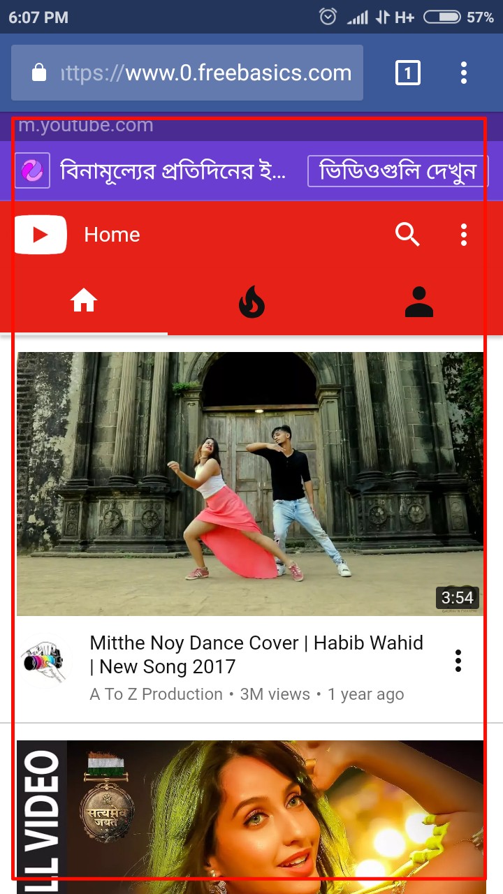 গুগল, ফেসবুক, টুইটার, ইনস্টগ্রাম, লিংকডইন, ইয়াহু ও উইকিপিডিয়া ছাড়াও জনপ্রিয় ভিডিও স্ট্রিমিং সাইট ইউটিউবও এখন ফ্রিব্যাসিক্সের মাধ্যমে ইউস করতে পারবেন ঠিক উপরের স্ক্রিনশটের মত। ফ্রি ইউটিউব চালাতে ফ্রিব্যাসিক্স সাইটের হোমপেজের জনপ্রিয় লেভেলের নিচের Youtube লেখা বা আইকনটিতে ক্লিক করুন। তবে হ্যাঁ, ভিডিও আসলেও ভিডিওগুলো চালাতে পারবেন না। অথবা এই https://www.0.freebasics.com/https/m.youtube.com/ লিংকে ক্লিক করুন বা কপি করে ব্রাউজারের সার্চবারে পেস্ট করে সার্চ করুন।