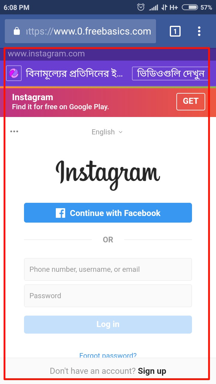 গুগল, ফেসবুক, টুইটার ছাড়াও এখন ফ্রিব্যাসিক্সের মাধ্যমে ইনস্টাগ্রামও ইউস করতে পারবেন ঠিক উপরের স্ক্রিনশটের মত। ফ্রি ইনস্টাগ্রাম চালাতে ফ্রিব্যাসিক্স সাইটের হোমপেজের জনপ্রিয় লেভেলের নিচের Instagram লেখা বা আইকনটিতে ক্লিক করুন। অথবা এই https://www.0.freebasics.com/https/www.instagram.com/ লিংকে ক্লিক করুন বা কপি করে ব্রাউজারের সার্চবারে পেস্ট করে সার্চ করুন।