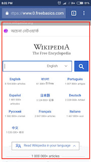 গুগল, ফেসবুক, টুইটার, ইনস্টাগ্রাম, লিংকডইন, ইয়াহু ছাড়াও বিশ্বতথ্যকোষ উইকিপিডিয়াও এখন ফ্রিব্যাসিক্সের মাধ্যমে ইউস করতে পারবেন। ফ্রি উইকিপিডিয়া চালাতে ফ্রিব্যাসিক্স সাইটের হোমপেজের জনপ্রিয় লেভেলের নিচের Wikipedia লেখা বা আইকনটিতে ক্লিক করুন। অথবা এই https://www.0.freebasics.com/https/www.wikipedia.org/ লিংকে ক্লিক করুন বা কপি করে ব্রাউজারের সার্চবারে পেস্ট করে সার্চ করুন।