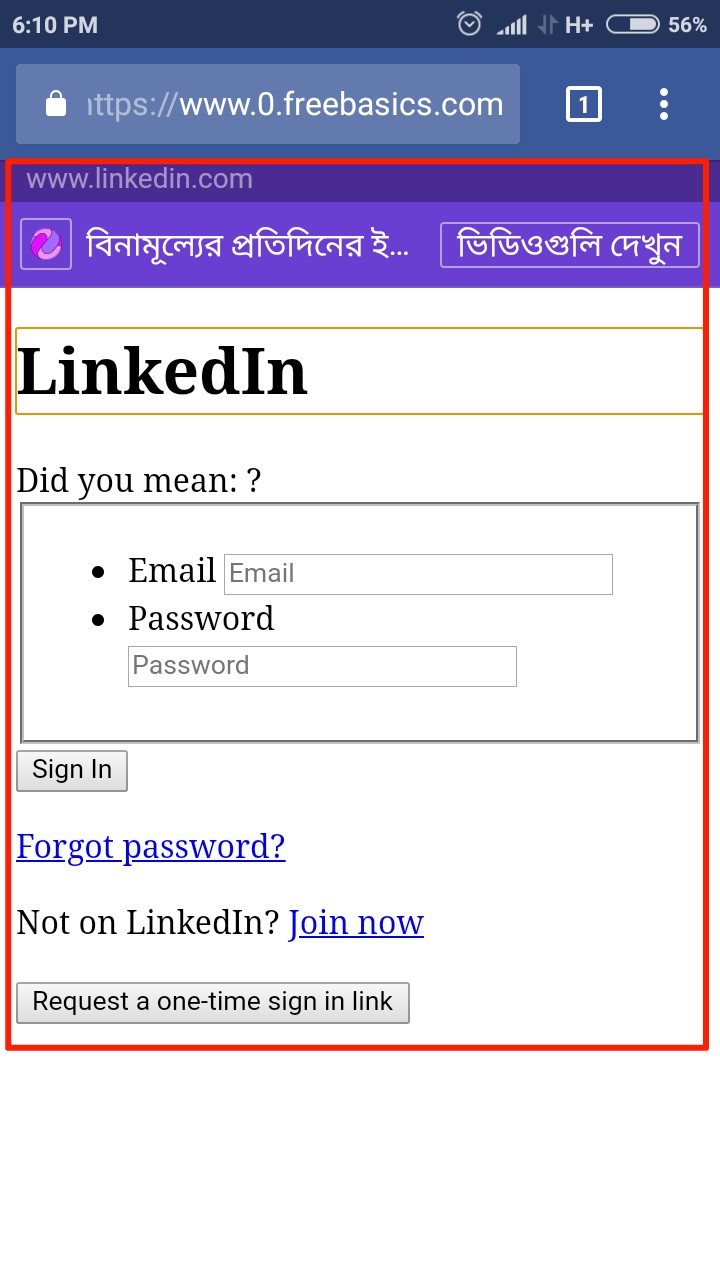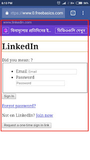গুগল, ফেসবুক, টুইটার ও ইনস্টাগ্রাম ছাড়াও এখন লিংকডইন ফ্রিব্যাসিক্সের মাধ্যমে ইউস করতে পারবেন ঠিক উপরের স্ক্রিনশটের মত। ফ্রি লিংকডইন চালাতে ফ্রিব্যাসিক্স সাইটের হোমপেজের জনপ্রিয় লেভেলের নিচের Linkedin লেখা বা আইকনটিতে ক্লিক করুন। অথবা এই https://www.0.freebasics.com/https/www.linkedin.com/ লিংকে ক্লিক করুন বা কপি করে ব্রাউজারের সার্চবারে পেস্ট করে সার্চ করুন।