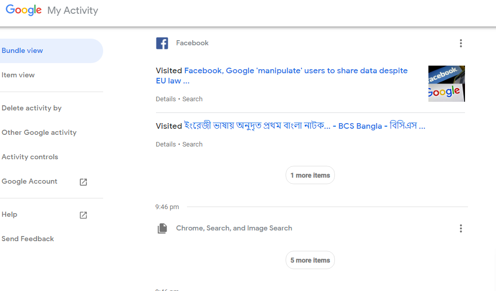 Google সংরক্ষণ করে আপনার প্রতিটি ডিভাইসের সার্চ হিস্টোরি। তার মানে দাঁড়ায় আপনি যদি কোন ডিভাইসের সার্চ হিস্টোরি মুছে ফেলেন সেসব হিস্টরি Google এর কাছে সংরক্ষণ থাকে এবং তা কখনোই মুছে ফেলা যায় না। আপনার নিজের সার্চ হিস্টোরি দেখতে এই লিঙ্কে ক্লিক করুন