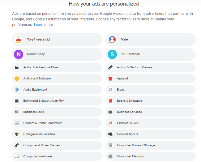 গুগল আপনার জন্য একটা বিজ্ঞাপণ প্রোফাইল তৈরি করে রেখছে। এই প্রোফাইলটি সম্পূর্ণ নির্ভর করে আপনার তথ্যের উপর। এসব তথ্যের মধ্যে রয়েছেঃ আপনার অবস্থান, লিঙ্গ, বয়স, শখ, পেশা, আগ্রহ, রিলেশনশিপ স্ট্যাটাস, আপনার ওজন, ইনকাম।