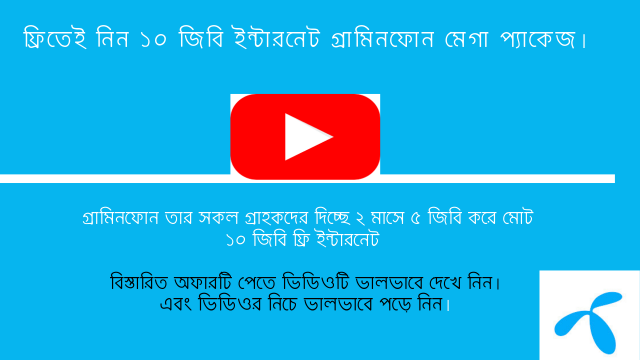 প্রিয় বন্ধুরা কেমন আছেন সবাই। আজ আপনাদের সাথে যে টিপ্সটি শেয়ার করতে চাচ্ছি তা হল গ্রামিন ফোনে ১০ জিবি ইন্টারনেট ফ্রি অফার, কম বেশি সবাই নিতে পারবেন। কেননা আমিও পেয়েছি তাই আপনাদের সাথে শেয়ার করতে চাচ্ছি, আমি ইন্টারনেট অফার এর বিস্তারিত দেখেছি ইউটিউবের একটি ভিডিওতে আপনারা ভিডিওটি ভালভাবে দেখলে আশা করি অফারটি আপনারাও পাবেন। আমি যেই ইউটিউবের ভিডিও দেখে অফারটি পেয়েছি সে ভিডিওর লিংক টি হলঃ