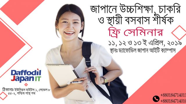 Daffodil Japan IT জাপানিজ ও দেশের স্বনাম ধন্য ড্যাফোডিল গ্রুপের ড্যাফোডিল জাপান আইটি একটি অঙ্গ প্রতিষ্ঠান। সফলতার সাথে শত শত শিক্ষার্থী ড্যাফোডিল জাপান আইটির মাধ্যমে জাপানে ক্যারিয়ার গড়েছেন। সেই সফলতার ধারাবাহিকতায় আবারও আমরা উচ্চ শিক্ষা ও চাকরি বিষয়ক সেমিনার আয়োজন করেছি। আপনাদের সবাইকে সেমিনারে আমন্ত্রণ। সেমিনারটি সকলের জন্যে উন্মুক্ত।