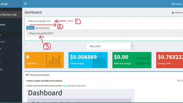 - ৪. আপনার account খুলে গেলে dashboard -এ ক্লিক করে উপরের মতো ছবি দেখতে পাবেন। এখানে আপনি ছবি অনুযায়ী ১-এ আপনার লিঙ্ক টা দিয়ে ২-এ "shorten" বাটনে ক্লিক করে ৩-এ আপনার লিঙ্কটি ready হয়ে গেছে এবং ৪-এ আপনি এটাকে কপি করে আপনি আপনার বন্ধু অথবা আপনার ওয়েবসাইটে শেয়ার করতে পারেন। ১০, ০০০ ক্লিক পরলেই আপনি ১০০-১৬০ ডলার পেয়ে যাবেন। শধু মাত্র ক্লিকের ওপর ভিত্তি করেই নয়, এই সাইট আপনাকে রেফারেল লিঙ্ক প্রদান করে যার মাধ্যমে যদি কেও আপনার রেফারেল লিঙ্ক থেকে join করে এই সাইটটিতে তাহলে সে যা আয় করবে তার ৫০% এই সাইট আপনাকে প্রদান করবে কোনো কিছু না করেই। এছাড়া এই সাইট আপনাকে একটা বড় ফিচারস provide করে যা সম্ভবত অন্য কেও করবে না। এই সাইট থেক আপনি আপনার নিজের ডিজাইনের ব্যানার তৈরি করতে পারবেন এবং এটি ব্যবহার করে আপনি আপনার নিজের "Url Shortener" ওয়েবসাইট তৈরি করতে পারবেন। শেষেরটির প্রতি অবশ্যই মনোযোগ দেবেন এটির মাধ্যমে আপনি নিজের সাইট তৈরি করে নিজের একটা ভালো ক্যারিয়ার তৈরি করতে পারেন।