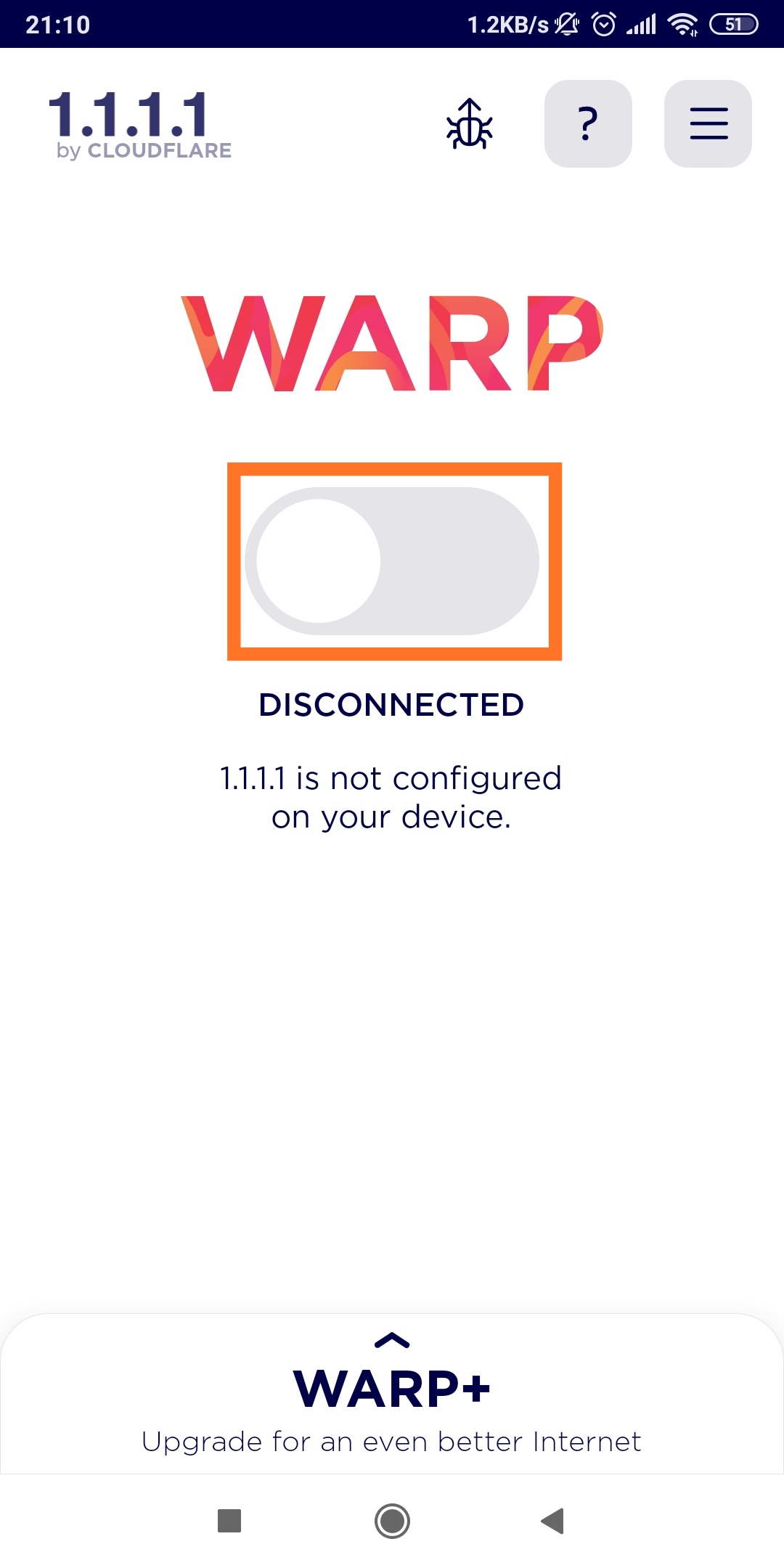 প্রথম ধাপঃ WARP অ্যাপ কানেক্ট করতে নিচের ছবিতে মার্ক করে দেখানো বাটনে ক্লিক করুন।