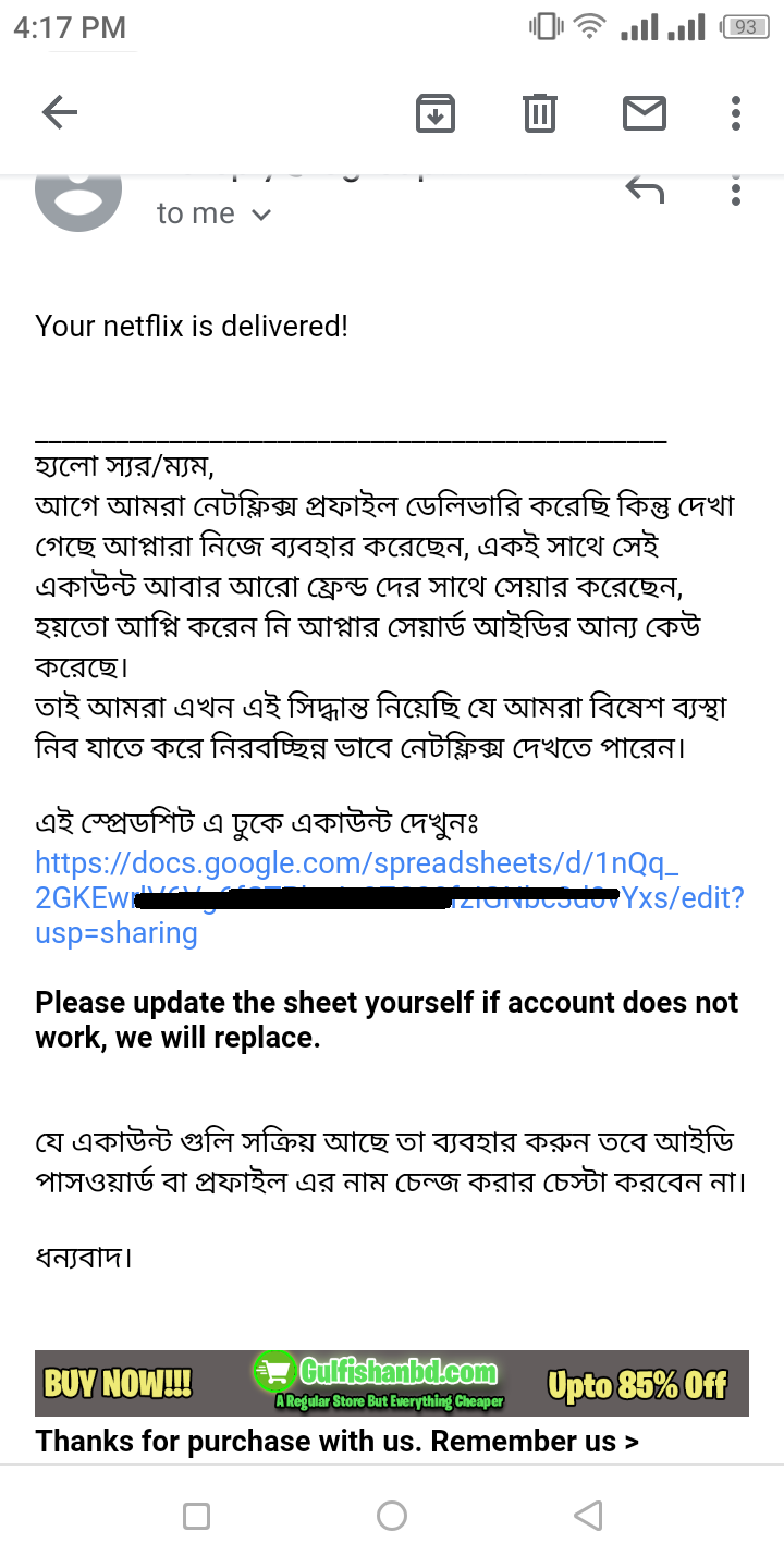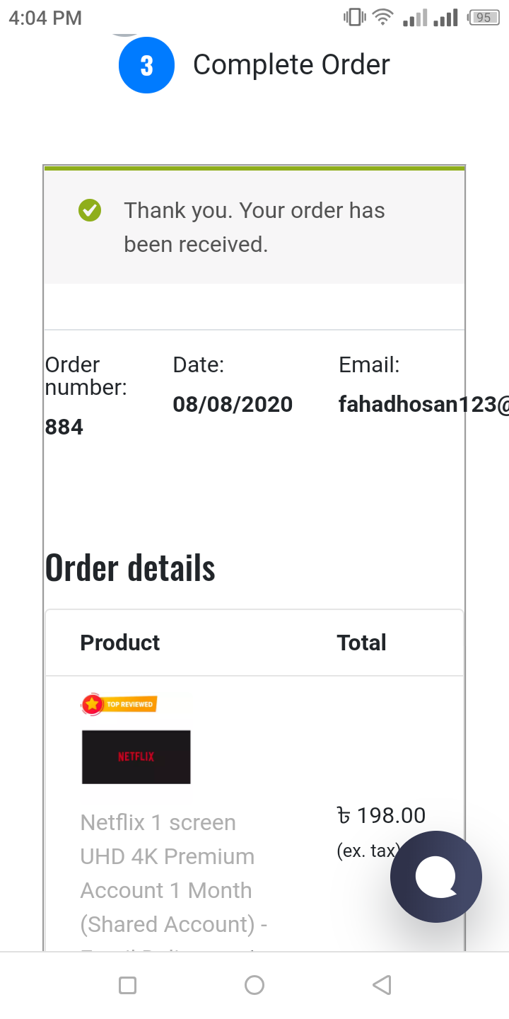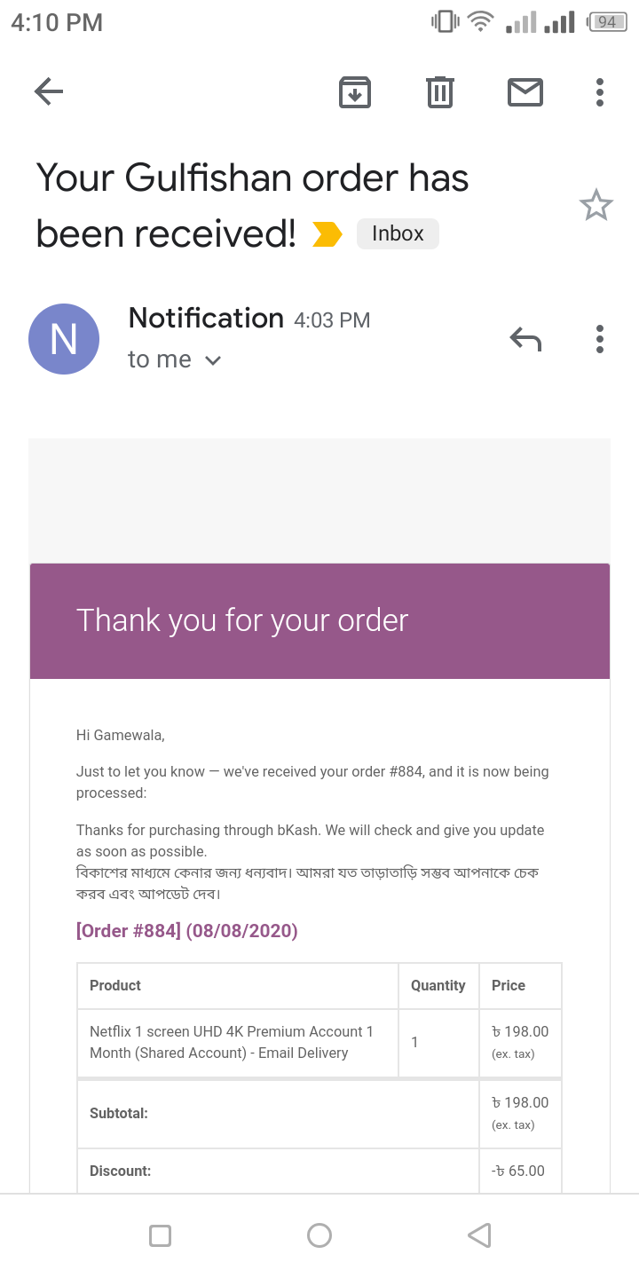 ১২) অর্ডারের ধরন অনুযায়ী অর্ডার কনফার্ম করার ৫ মিনিট থেকে সর্বোচ্চ ২৪ ঘন্টার মধ্যে আপনি ইমেইলে আপনার অর্ডারটি পেয়ে যাবেন। তবে নেটফ্লিক্স এর ক্ষেত্রে আমি ৩ মিনিটেই পেয়ে গিয়েছি।