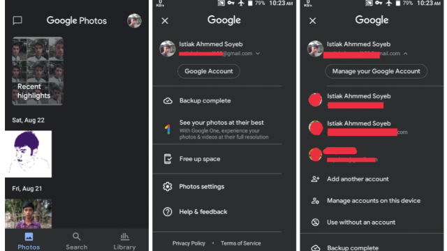 আপনি চাইলে নিজের ইচ্ছামতো ম্যানুয়ালি ফটো ব্যাকআপ করতে পারবেন। ম্যানুয়ালি ফটো ব্যাকআপ করতে উপরে ডান পাশে থাকা প্রফাইল আইকনে ক্লিক করুন। এবং যে একাউন্টটিতে আপনি ব্যাকআপ করতে চান সেই অ্যাকাউন্ট সিলেক্ট করুন। অ্যাকাউন্ট সিলেক্ট করতে আগে বর্তমান ইমেইল অ্যাড্রেস টিতে ক্লিক করুন এতে বাকি ইমেইল অ্যাড্রেস গুলো দেখতে পাবেন। যদি আপনার ফোনে একটা মাত্র ইমেইল অ্যাকাউন্ট থাকে বা আপনি চাচ্ছেন সেই অ্যাকাউন্ট টিতেই ব্যাকআপ করবেন এক্ষেত্রে কিছু করার দরকার নেই।
