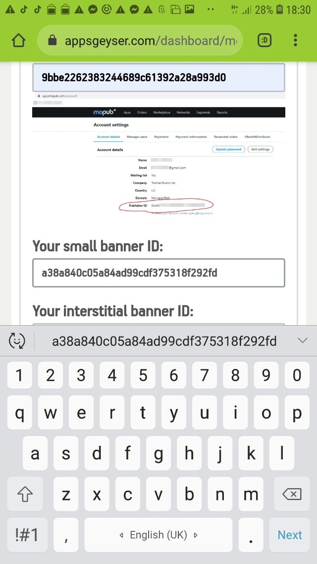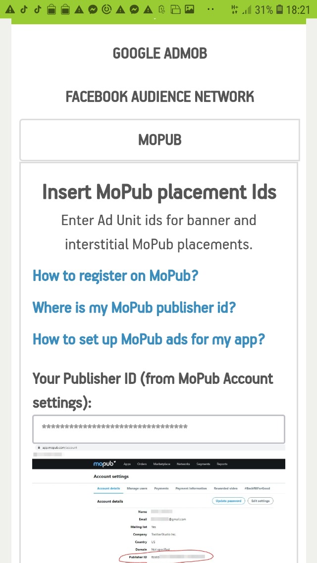 ৮. ওই কোডটি কপি করা হয়ে গেলে আপনি appsgeyser.com ওয়েবসাইটটিতে যে দুটি বক্স দেখতে পাবেন ওই দুটি বক্সে আপনার কোড বসাবে। প্রথম বক্সটিতে যে কোডটা বসাবেন সেটা হল mopub.com ওয়েব সাইটে আপনার একাউন্ট কোড এবং দ্বিতীয় বক্সে বসাবেন আপনি যে এড কোডটি পেলেন ওইটা। তারপর সেভ চেঞ্জ অপশন এ ক্লিক করবেন।