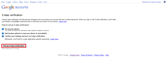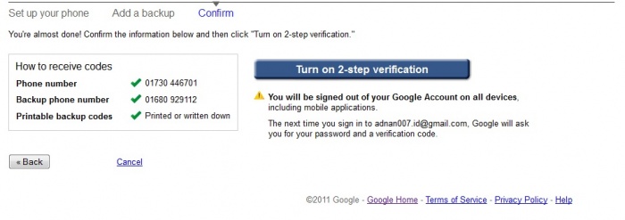 ব্যাস আপনি এখন তৈরী। Turn on 2-step verification এ ক্লিক করুন। তাহলে হয়ে গেল ২ স্টেপ ভেরিফিকেশন অন।
