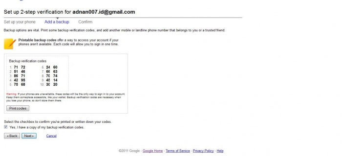 আপনার ফোনের জন্য কোড সেট আপ করলেন। কিন্তু ফোন হারিয়ে গেলে কি করবেন। এ পেজ এ সেটাই বলা হয়েছে। এবার ফোন আপনার সাথে না থাকলে বা হারিয়ে গেলে কি করতে হবে সেটাই সেটিং করব। এ পেজ এ নেক্সট ক্লিক করুন। কিছু কোড আসবে। যা আপনি যেকোন সময় ইউজ করতে পারবেন। তবে প্রত্যেকটা কোড একবার। আপনি যেকোন সময় রিজেনারেট করে নতুন ১০ টি কড পেতে পারেন। এগুলো সংরক্ষন করুন। সম্ভব হলে প্রিন্ট করুন। Yes, I have a copy of my backup verification codes. এ টিক চিহ্ন দিয়ে নেক্সট চাপুন।