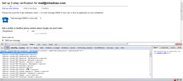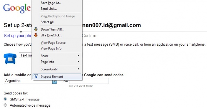 Step 5:এবার আসল কাজ । একটা ড্রপ-ডাউন লিস্ট থাকবে। সেখানে Text message (SMS) or voice call সিলেক্ট করুন। তাহলে আরও কিছু অপশন দেখা যাবে। এখানে আপনার মোবাইল নাম্বার সেট করতে হবে। একটা ড্রপ ডাউন লিস্ট আসবে যেটা দেশের লিস্ট আর একটা টেক্সটবক্স মোবাই নাম্বার দেয়ার জন্য। এই দেশের লিস্টে বাংলাদেশ না থাকায় আমরা এই সেবাটি ব্যবহার করতে পারিনা। ড্রপ ডাউন লিস্টটির উপর রাইট ক্লিক করুন এবং ইন্সপেক্ট এলিমেন্ট এ ক্লিক করুন। তাহলে ফায়ারবাগ উইন্ডো ওপেন হবে।
