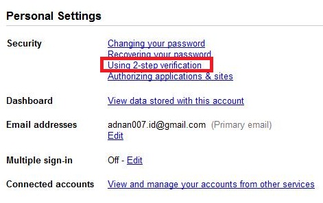 এখন আপনি আপনার Account পেজ এ আছেন। সেখানে Personal Settings থেকে Using 2-step verification ক্লিক করুন।