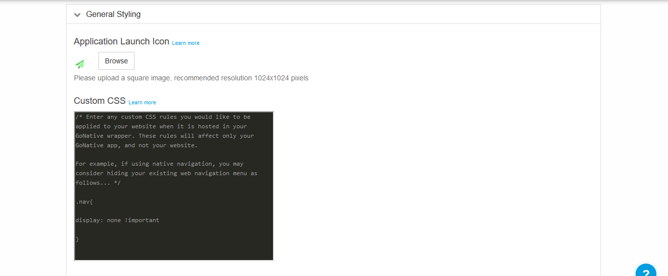 এখানে আপনি প্রথমেই দেখতে পাবেন আপনাকে আপনার অ্যাপের জন্য একটি লোগো দিতে বলতেছে। তার জন্য Browse বাটনে ক্লিক করুন এবং আপনার কম্পিউটার থেকে আপনার অ্যাপের লোগোটি সিলেক্ট করে দিন। তাহলে আপনার অ্যাপে আপনার লোগোটি সেট হয়ে যাবে। তারপর custom css অংশে আপনি যদি আপনার অ্যাপের জন্য কিছু সিএসএস লিখতে চান তাহলে এই অংশে লিখতে পারবেন। আর আপনি যদি সিএসএস না জানেন তাহলে এখানে হাত দেওয়ার দরকার নাই। আর পরের অপশন গুলো এতটা গুরুত্বপূর্ণ না এগুলো তারা নিজে থেকেই সেটিং করে নিবে। আপনি চাইলে আপনার মতো সেটিং পরিবর্তন করতে পারেন। তবে বেশিরভাগ এটা করা লাগবে না।