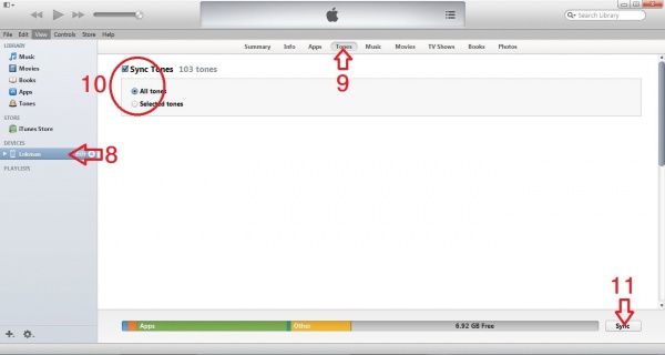 এবার Output Folder থেকে রিংটোন গুলো একটা নতুন ফোল্ডার বানিয়ে এক জায়গায় সেভ করে রাখুন। সেভ করার পর iTunes ওপেন করে Add File to Library or Add Folder to library সিলেক্ট করে রিংটোন গুলো iTunes এ নিয়ে নিন। যদি প্রতিটা রিংটোন এ ডাবল ক্লিক করেন তাহলেও iTunes এ ছলে যাবে। অথবা সবগুলো রিংটোন সিলেক্ট করে ধরে নিয়ে iTunes এর উপর ছেড়ে দিলেও তা iTunes এ চলে যাবে। এবার নিচের ছবির মত স্টেপ বাই স্টেপ দেখে Sync করলেই তা Settings - Sounds এ রিংটোন হিসেবে পাবেন।