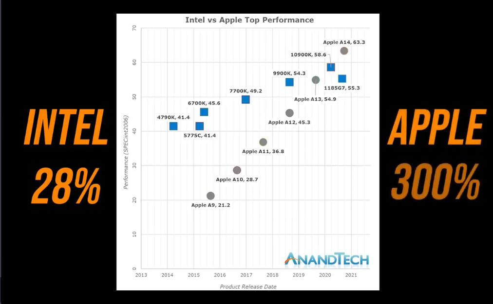 ২০১৮ সালে A12 চিপ দেখে মনে হচ্ছিল অ্যাপল হয়তো Intel কে ধরেই ফেলছে। নিচের চার্টটি খেয়াল করুন যেখানে intel পাঁচ বছরে তাদের ফ্ল্যাগ-শিপ পারফরম্যান্স বাড়িয়েছে ২৮% সেখানে অ্যাপল বাড়িয়েছে ৩০০%। আমরা যদি খেয়াল করি তাহলে দেখব Intel এর core i9 10900k চিপটি ছিল ডেক্সটপ চিপ যার 125 watts পাওয়ার দরকার হতো এবং A14 এর দরকার হতো মাত্র 5 watts। একাধিক ইউটিউবাররা এই দুটি চিপের মধ্যে পারফরম্যান্স চেক করে A14 চিপকেই জয়ী করেছে।
