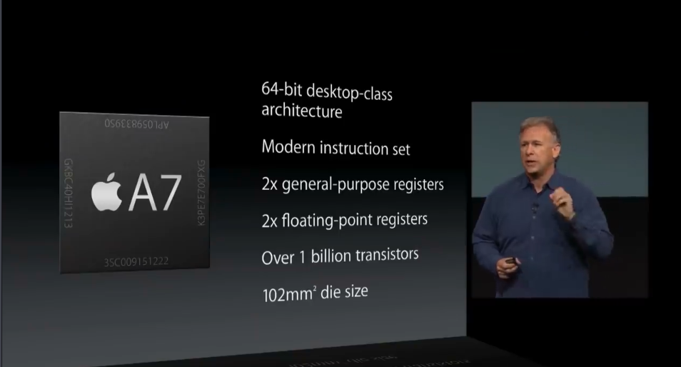 ইন্ডাস্ট্রিতে সবচেয়ে বড় ধাক্কাটি এসেছিল ২০১৩ সালে যখন অ্যাপল 64-bit আর্কিটেকচারের A7 চিপ তৈরি করে। এই চিপটি ব্যবহার করা হয় iPhone 5s এ। অ্যাপল এতটাই দক্ষতা প্রমাণ করে যে তারা ARM এর মুল CPU গুলোকেও ছাড়িয়ে যায়। পরবর্তী ARM ২০১৪ সালে Galaxy s4 এ নিজেদের 64-bit সি পি ইউ এর সূচনা করে। অ্যাপল তখনই বলেছিল যে তারা ডেক্সটপ ক্লাস আর্কিটেকচার তৈরি করছে। তখন মানুষ এটিকে বিশ্বাস না করলেও, আলটিমেটলি কিন্তু সেটাই হয়েছিল।