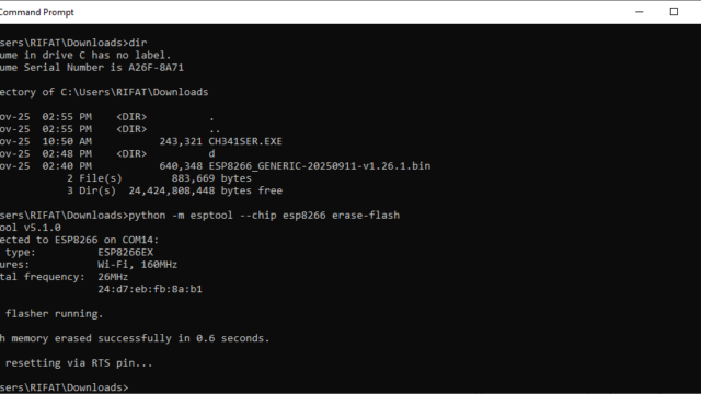 python -m esptool -chip esp8266 -port COM14 write-flash -flash-mode dio -flash-size detect 0x0 ESP8266_GENERIC-20250911-v1.26.1.bin