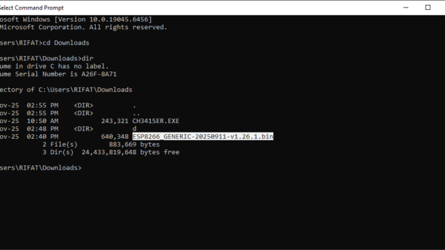 ESP8266 এর .bin ফাইলটি ডাউনলোড করার পর, এটি সাধারণত আপনার Downloads ফোল্ডারেই সেভ হয়ে থাকবে। তাই এখন Command Prompt খুলে নিচের কমান্ড দিয়ে সেই ফোল্ডারে চলে যান —