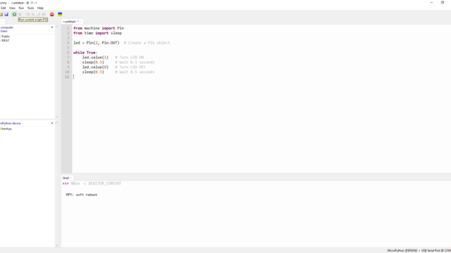 এখন Code Editor এ নিচের কোডটি Copy করে পেস্ট করুন। তারপর Run>Run current script (বা F5) ক্লিক করতেই মাইক্রোকন্ট্রোলারে কোডটি Run করবে!