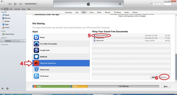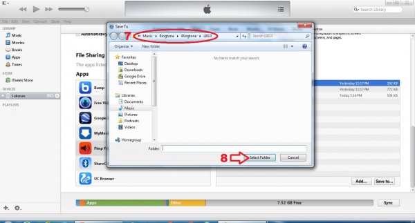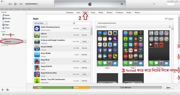 প্রথমে ইন্টারনেট থেকে বিভিন্ন অ্যাপস দিয়ে রিংটোন, গান, ভিডিও, ফাইল ডাউনলোড করে নিন। এবার আপনার আইফোন কম্পিউটারের সাথে সংযোগ করে iTunes ওপেন করুন। iTunes ওপেন করলে আপনার আইফোনের নামের উপর ক্লিক করে উপর থেকে Apps সিলেক্ট করুন। এবার ডানদিক থেকে স্ক্রল করে করে নিচের দিকে যান।