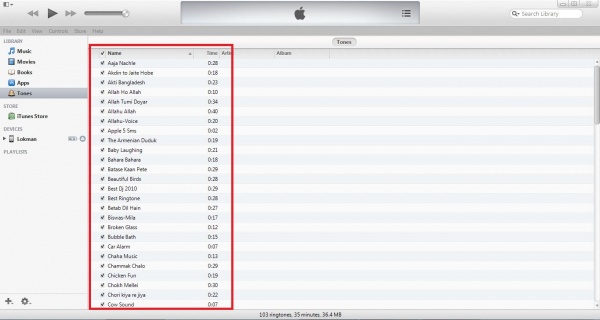 এবার বামদিক থেকে আপনার নামের আইফোনে গিয়ে উপর থেকে Tones এ যান। All Tones সিলেক্ট করে বা যেটা যেটা নিবেন তা সিলেক্ট করে নিচে ডানে Sync এ ক্লিক করলেই আপনার আইফোনে রিংটোনগুলো চলে যাবে। এভাবে আপনি Music, Movies অপশন থেকে গান, ভিডিও আইফোনে ভরতে পারবেন।