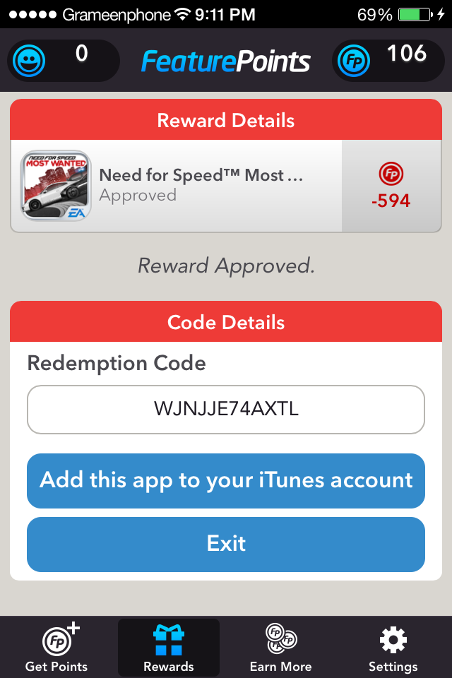 উপরের ছবির মত, আপনার সংগ্রহ করা পয়েন্টস এর ভিত্তিতে Feature Points এর Rewards সেকশন থেকে Choose your Own App এ ক্লিক করলে একটি Search option পাবেন, শেখান থেকে আপনার পছন্দের অ্যাপ সিলেক্ট করে Claim করবেন। তখন আপনাকে একটি Redeem Code দেয়া হবে. উক্ত Code পাওয়ার পর Add this app to your iTunes account এ ক্লিক করলেই Appstore ওপেন হয়ে আপনার App ডাউনলোড হওয়া শুরু করবে।