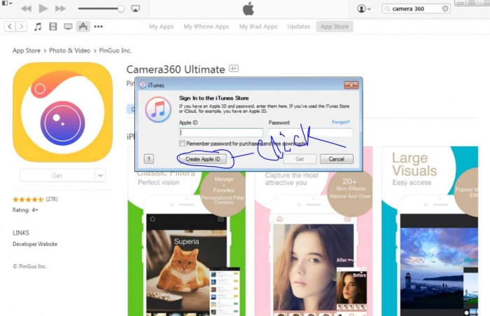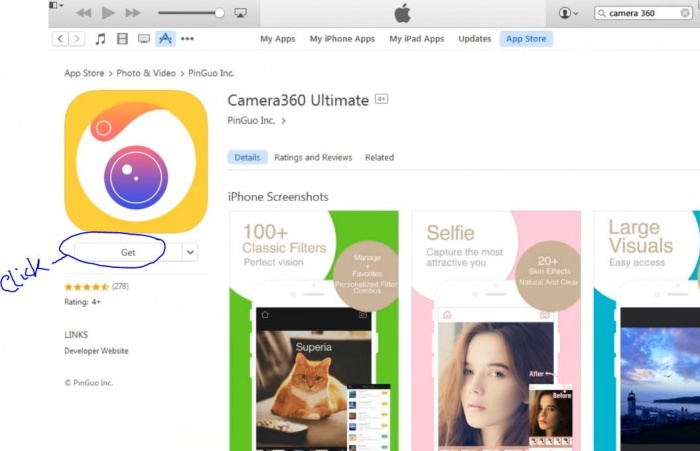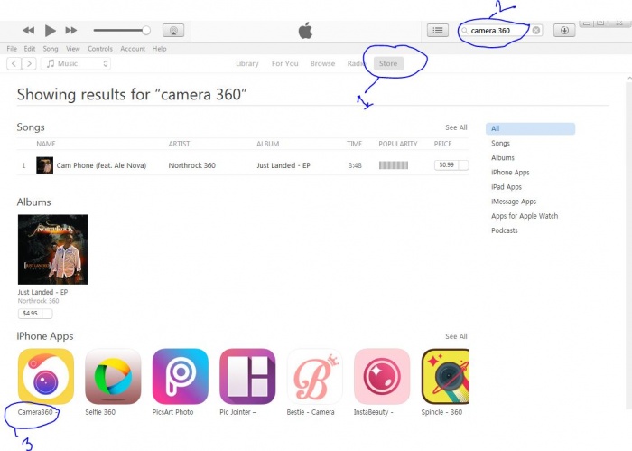 iTunes চালু করে Store এ click করুন। তারপর সার্চ Option camera 360 লেখে Enter এ ক্লিক করুন। তারপর camera 360 ক্লিক করুন।