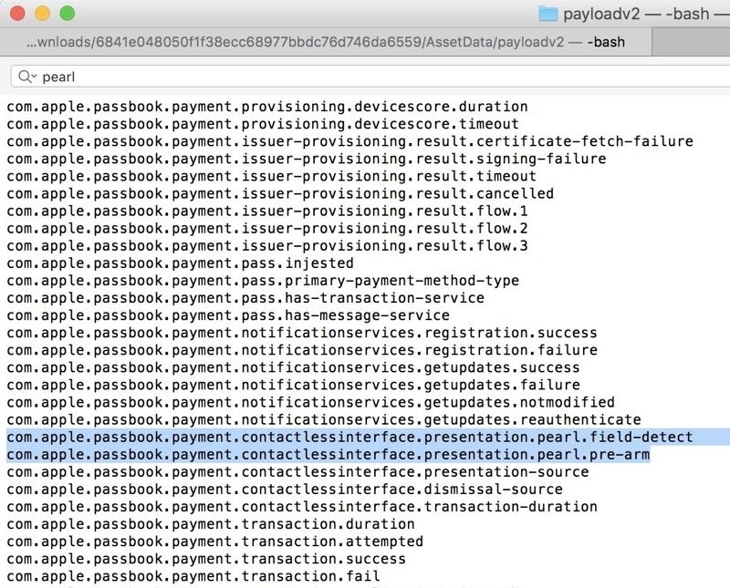 আইওএস ডেভেলপারদের তৈরি হোমপড ফার্মওয়্যারে একটি “com.apple.passbook.payment” নামক স্ট্রিং পাওয়া যায়। এতে অন্যান্য পেমেন্ট ভেরিফিকেশন ডেটাবেইজে দুই ধরনের রেফারেন্সের সন্ধান মেলে। একটি হলো “pearl.field-detect” এবং অন্যটি হলো “pearl.pre-arm”। আগের কিছু ফাঁস হওয়া তথ্য থেকে ধারণা করা যায় যে “pearl” দ্বারা পার্ল আইডি’কে বোঝায় যা অ্যাপলের মুখ সনাক্তকরণ পদ্ধতির কোডনেম।