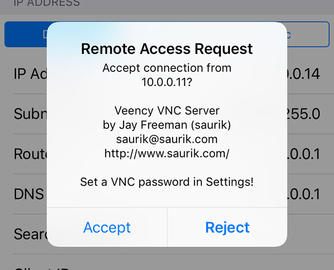 এখন আপনার জেইলব্রেক করা ডিভাইসটি রিমোট কন্ট্রোলের জন্য উপযুক্ত। দুইটি ডিভাইসই একই লোকাল ওয়াই-ফাই-য়ে কানেক্টেড থাকা অবস্থায়আপনার আই ও এস ডিভাইসের Settings > Wi-Fi-তে যান। এরপর ইংরেজি ছোট হাতের আই (i) চিহ্নে ক্লিক করে আপনার নেটওয়ার্ক ঠিক করে নিন। অনেকগুলো নাম্বার দেখতে পাবেন যার মধ্যে গুরুত্বপূর্ণ হলো আপনার আই পি অ্যাড্রেস টা।