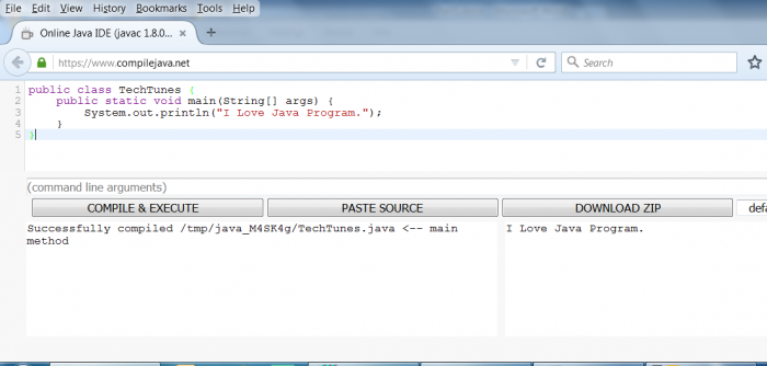 System হলো জাভার বিল্ট-ইন প্যাকেজ, এর সাব ক্লাস out তাই “.” চিহ্ন দিয়ে বুঝানো করা হয়েছে, out এর println/print মেথড রান করবে। } } দুইটা ক্লাস ক্লোজিং ও মেইন মেথড ক্লোজিং করেছে। প্রতিটি স্টেটমেন্ট শেষ হলে অবশ্যই সেমিকোলন(;) দিতে হবে। এবার কম্পাইল করার জন্য Start>cmd>চালু করে javac TechTunes.java লিখে কমান্ড দিলে TechTune.class নামে একটি জাভা বাইট কোডের ফাইল তৈরি হবে এবার java TechTunes লিখে কমান্ড দিলে I Love Java Program. লেখাটি দেখতে পাবো। কমান্ড প্রটম্প যেখান থেকে শুরু হয় সেখানে আপনার জাভা ফাইল টা রেখে দিবেন না হয় আপনার জাভা ফাইল যেখানে সেখানে পাথ সেট করে দিবেন। নইলে কমান্ড প্রটম্প জাভা ফাইল খুজে পাবে না। অর্থাৎ - cmd এখানে C:\Users\Administrator> হলে, জাভা ফাইলটা C:\Users\Administrator\TechTune.java হবে।