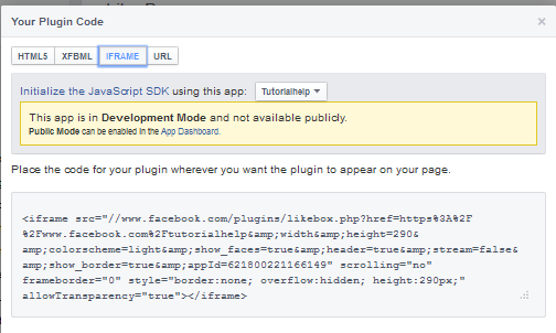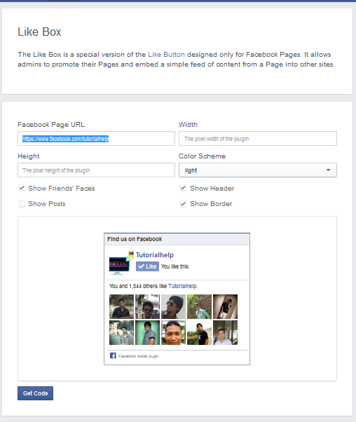 Facebook Page URL এখানে আপনার ফেসবুক পেজের URL টি লিখুন। এখান থেকে সাইজ কাষ্টম করা যাবে। এবার Get Code এ ক্লিক করুন। একটি পেজ ওপেন হবে।