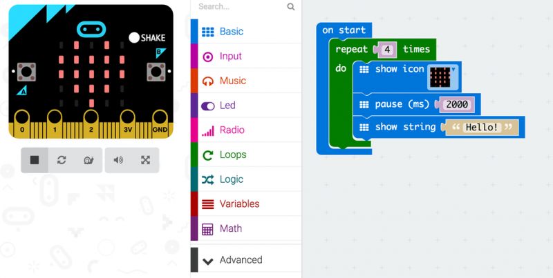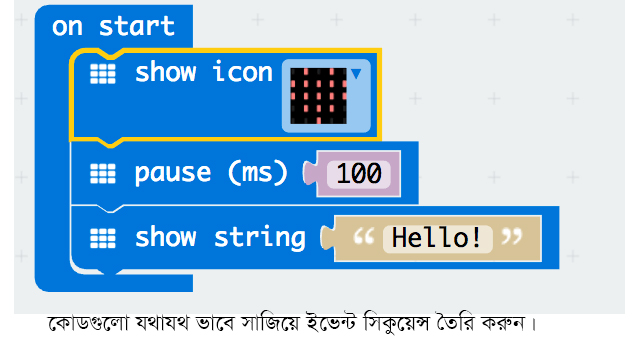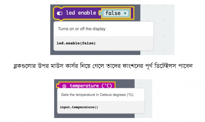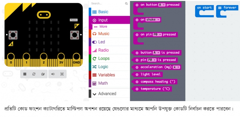 এই দুটি ব্লকে কোড যুক্ত করা হলো ড্রাগ এন্ড ড্রপ এর মতোই সহজ। কোড উইন্ডো এবং সিমুলেশনের মাঝে আপনি এপ্লিকেশন তৈরি করার জন্য যাবতীয় কমান্ড লিস্ট পাবেন। এই কমান্ড লিস্ট গুলো বিভিন্ন বিভাগে ভাগ করা থাকবে। যেমন micro:bit বোর্ডের কমান্ড লিস্টগুলো Basic, Input, Music, LED, Radio, Loops, Logic, Variables, Math ইত্যাদি বিভাগে ভাগ করা রয়েছে। এগুলোকে আপনি আপনার নিজের প্রয়োজন অনুযায়ী এক্সপ্লোর করে নিয়েন। তবে আপনি যদি আপনার পছন্দসই কোডটি গ্রুপ বিভাগে খুঁজে না পান তাহলে “more“ অপশনে ক্লিক করতে ভূলবেন না যেন!